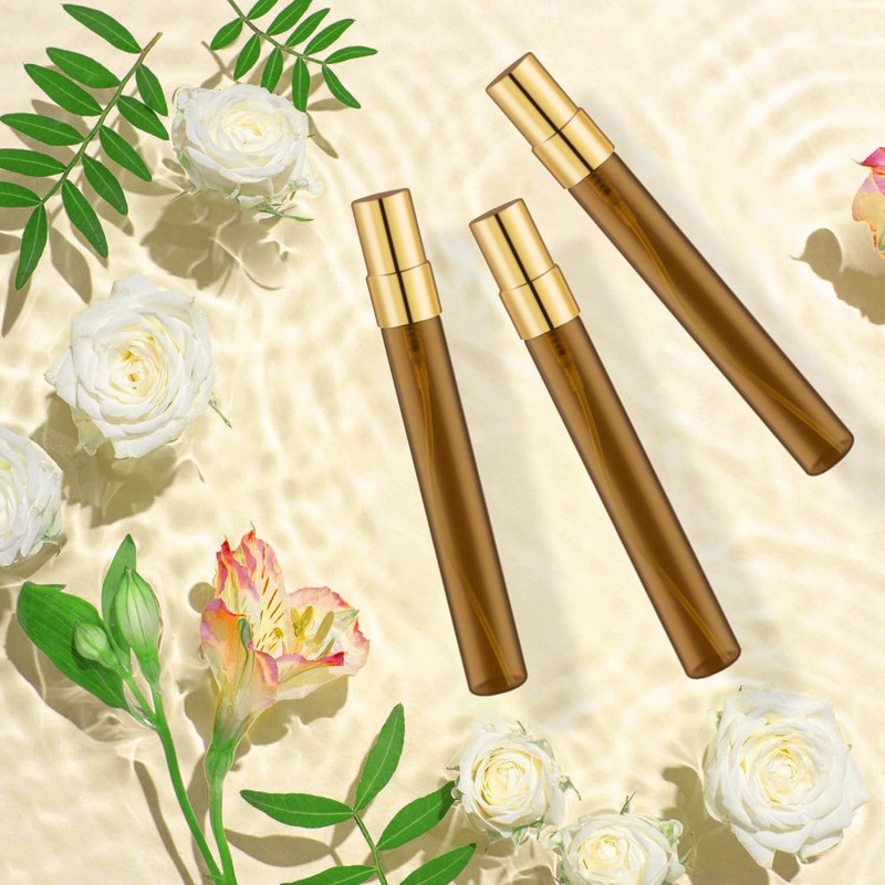 Nozefy 50 Pcs Amber Glass Mini Spray Bottle Empty Refillable Glass Perfume Bottles Travel Size Leakproof Spraying Vials Makeup Container with Gold Lids for Liquids Perfume - 10ml