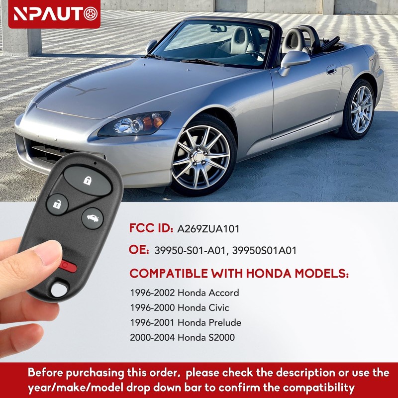 - đăCompatibilityă:The Key Fob Transmitter Replacement for 1996-2002 Honda Accord, 1996-2000 Honda Civic, 1996-2001 Honda Prelude, 2000-2004 Honda S2000ăNOTEăBefore purchasing this order, please check the description or use the year/make/model drop down bar to confirm the compatibility