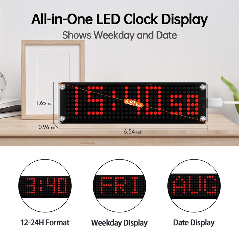 - Full Display Control,12/24H, Date, Seconds & More -- This digital clock with day and date lets you toggle between 12/24H modes, jumping or linear seconds, and show/hide leading zeros. It’s the perfect digital table clock or desk clock with date for users who value visual flexibility and data clarity.
