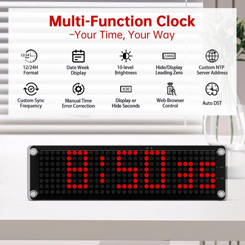 - Minimalist Red LED Matrix -- Perfect for Any Space,Sleek red design with a sharp LED matrix display fits modern décor. Use it as a digital clock for living room, nightstand clock, desk clock digital, or a smart clock for bedrooms. A must-have electronic clock for tech enthusiasts and minimalists alike.
