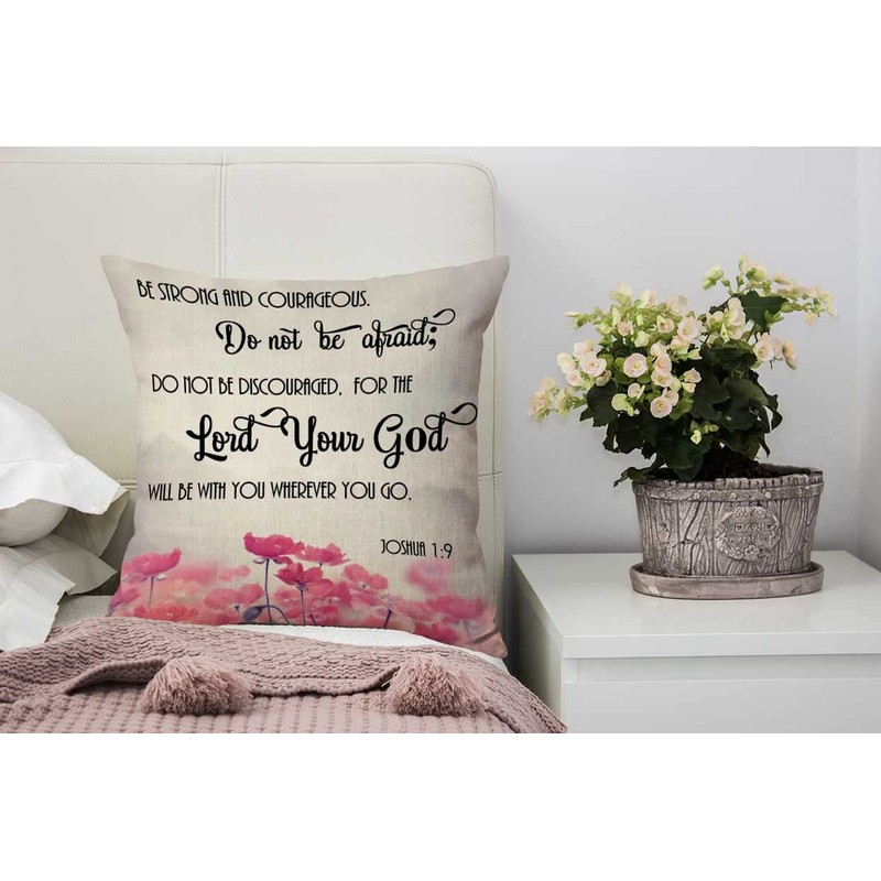 Nphuriy Pink Flowers Pillow Cover 16x16 Inch Christian Bible Verses Scripture Quotes Joshua 1:9 Farmhouse Decorative Throw Pillow Cover Square Cushion Case for Home Sofa Couch Decoration