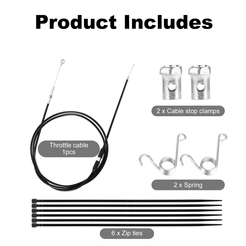 Package Includes: You will receive a go kart throttle cable kit, including 1 throttle cable, 2 cable stop clamps, 2 pedal brake and return springs and 6 zip ties.