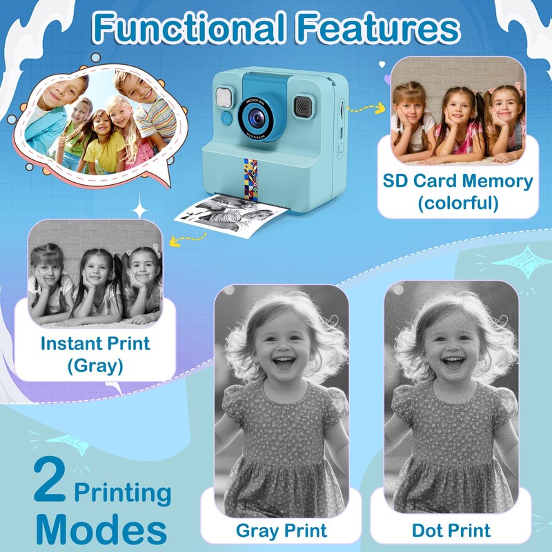 - Instant Print Camera: This instant camera in 3 color. Smooth, lightweight design is for little hands to hold. Kid camera with 3 rolls of printing paper, stores colorful memories and black-white photo printing. 16 language settings designed to grow alongside your child
