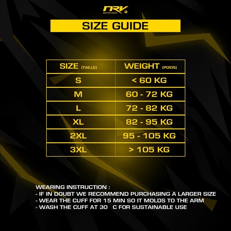 - Instructions for use: For optimal performance, wear the cuff for 15 minutes without playing the first time. You will feel the compression loosen after a few minutes, thus molding the cuff to your arm.