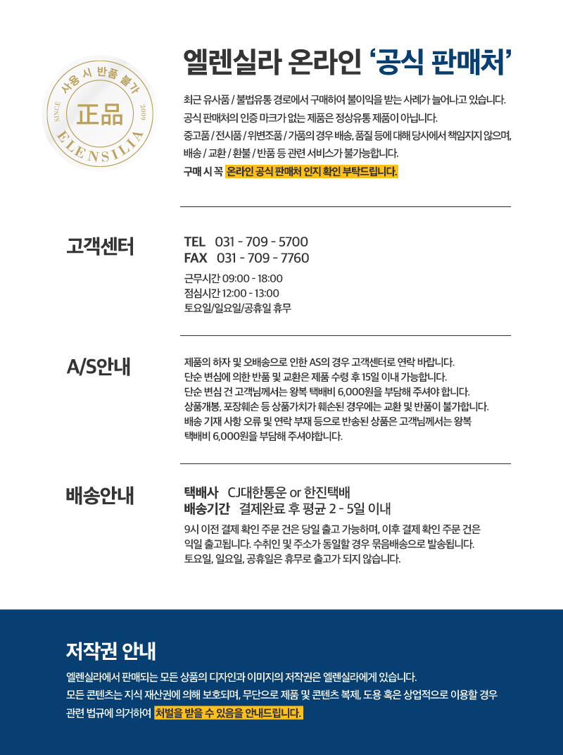 - 주문후 예상 배송기간: 주문일 기준 최대 3일 소요, 주문/제작상품 : 주문일 기준 최대 15일 소요 / 정확한 배송기간은 상품 및 상황에 따라 달라질 수 있습니다.