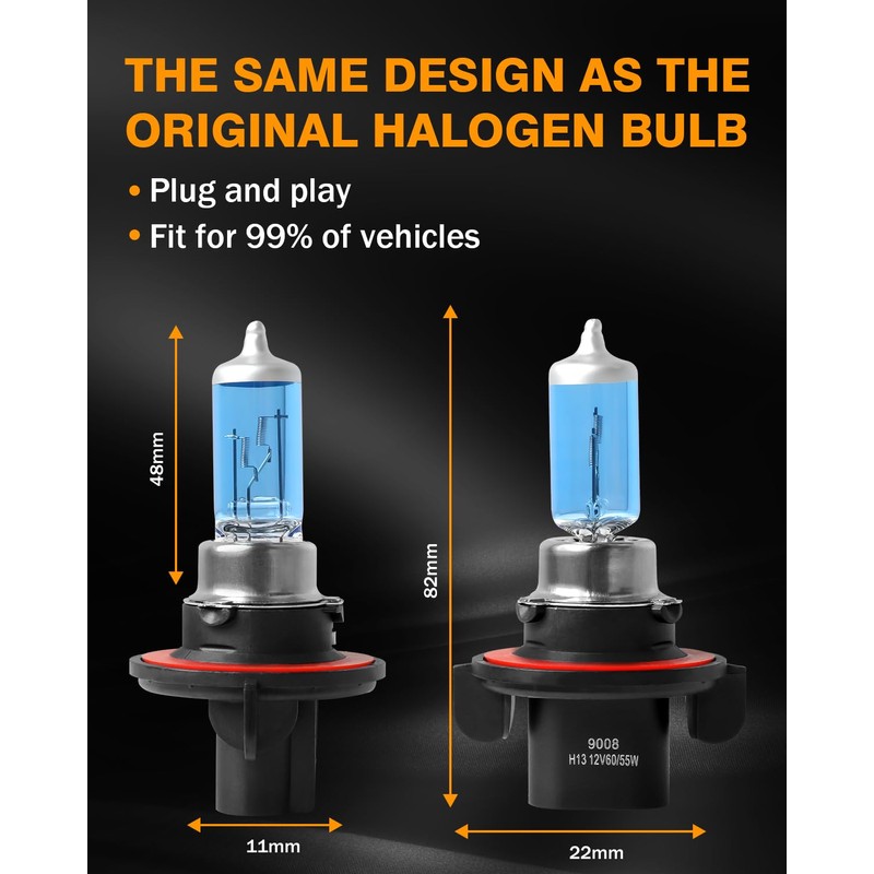 - 300% HIGH BRIGHTNESS: Halogen bulbs have brighter output and beam pattern, replace your dim bulbs, clearer vision while driving at night, safe and reliable. 1:1 beam pattern provides wider and farther ranges with no glare to oncoming traffic, no dark spots or shadow areas