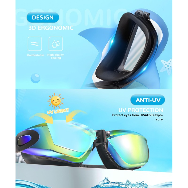 - [ANTI-FOG & UV PROTECTION] The inner lenses of the kids swimming goggles feature the latest anti-fog treatment, allowing children and teens to see underwater without blurring or distortion. The outer surface coating with UVA/UVB protection filters out irregular light and avoids glare, which protects their eyes from sunlight and harmful glare. Perfect for boys' and girls' swimming lessons to stimulate their interest in swimming.
