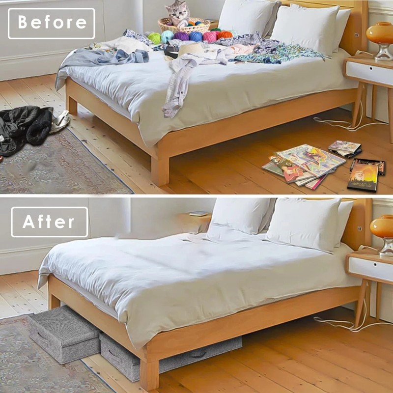 【FOLDABLE DESIGN】:The clothing under the bed storage box with a lid can fold easily into three sections. When not in use, under-bed storage organiser bins can be folded flat to save space. It is also stackable and has three sturdy carry handles for quick removal and use. Our high-quality material can be used many times without easy breaking and has met our family's storage needs for the last few years.