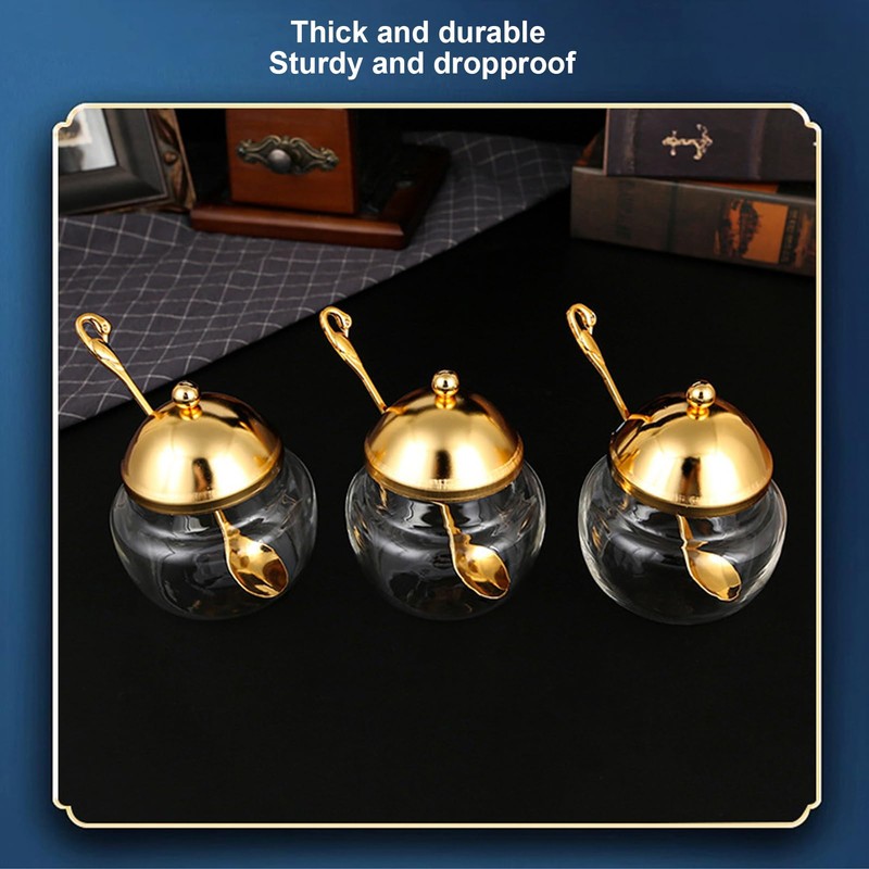 - Sophisticated Gold Finish: The polished metallic lids of the sugar jar with lid and spoon complement modern kitchen decor while providing airtight freshness for your spices