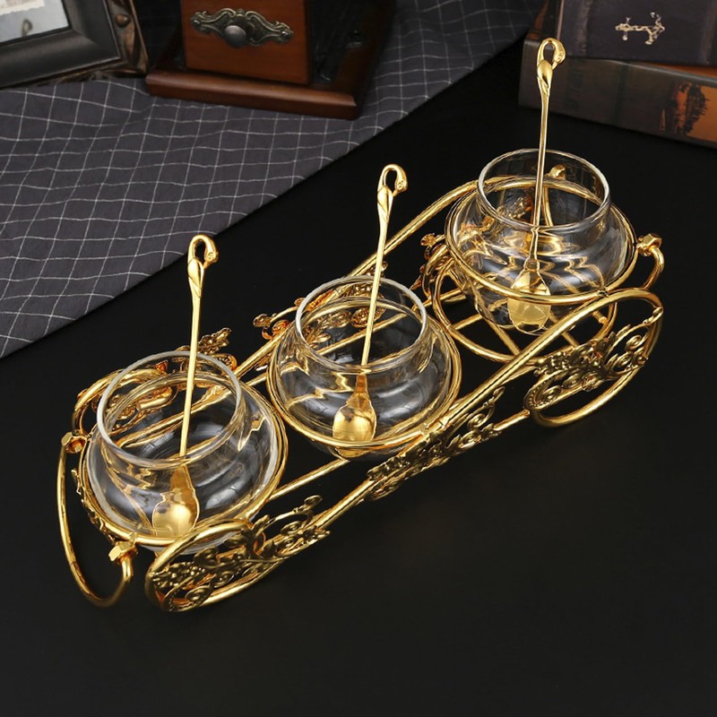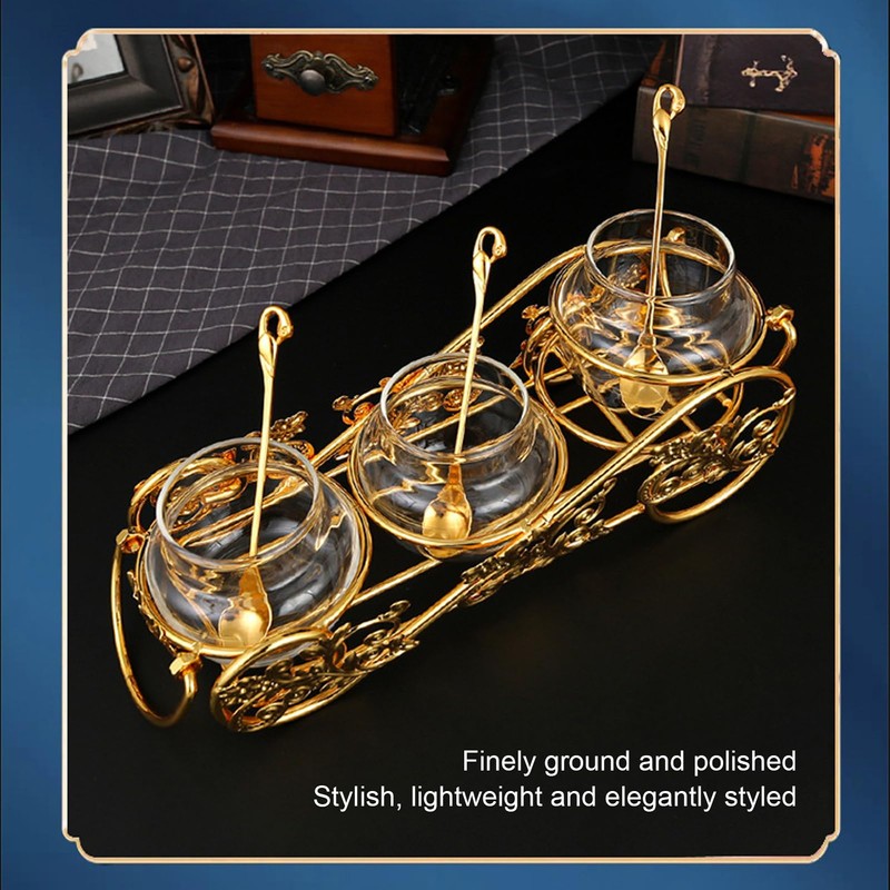 NSXAYIWE 3 Pcs Seasoning Box with Spoon and Lid, European Style Gold Salt Sugar Container Set, 10oz Glass Condiment Containers with Lids & Shelf for Coffee Bar Kitchen Accessories