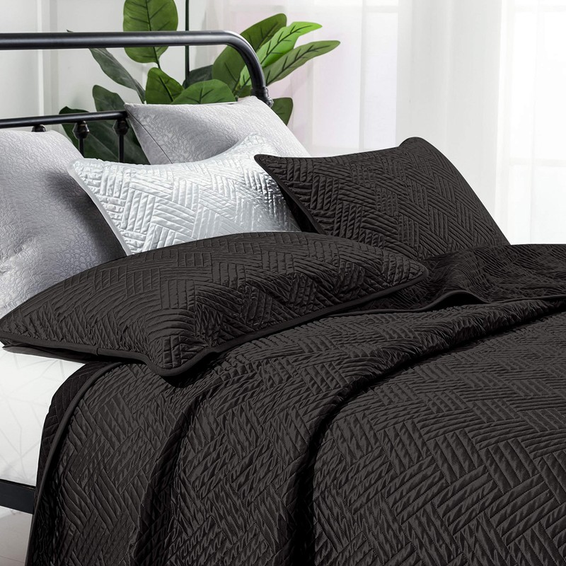 NTBAY King Silk Satin Quilt Set, Geometric Pattern Bedspread Luxury Quilted Coverlet Set for All Seasons(1 Quilt, 2 Pillow Shams), Black