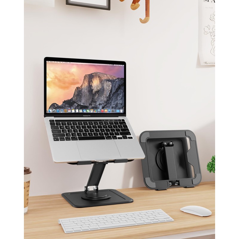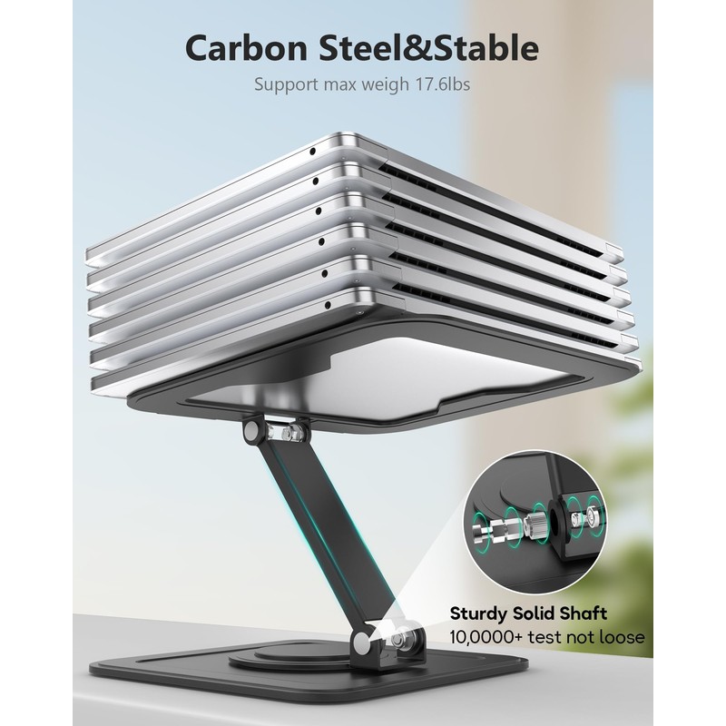 - 【360 Rotating Ergonomic Design】NTMY adjustable laptop stand for desk with 360 rotating base for laptops up to 16 inches, adjustable height up to 10.35 inch lift, and support max weight 17.6lbs/8kg.The Lifting height laptop stand holder works as a raiser to elevate the laptop screen to your eye level. The office computer stand let you fix posture and relieves neck, shoulder and spinal pain, it's very comfortable for working at home, office and outdoor, make typing more easier.