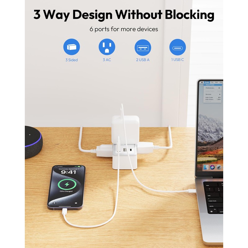 - 【Stylish Cubic 3-Way Design 6-in-1 Power Strip】This compact power board features three outlets, two USB-A ports, and one USB-C port in a sleek cube design. The power strip boasts a unique three-sided independent plug-and-play configuration that maintains its small footprint while enabling you to plug in multiple devices without obstructing neighboring sockets, fully leveraging its compact size for optimal space-saving benefits. Note: All USB ports output 5V/3.1A with a maximum of 15.5W.