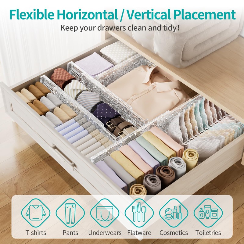 - Space saving design:The thickness of the divider is only 0.6'', this design will improve the space utilization, they can be placed vertically or horizontally, and even stacked in the drawer, providing a great deal of flexibility to fit the various sizes of the drawers.
