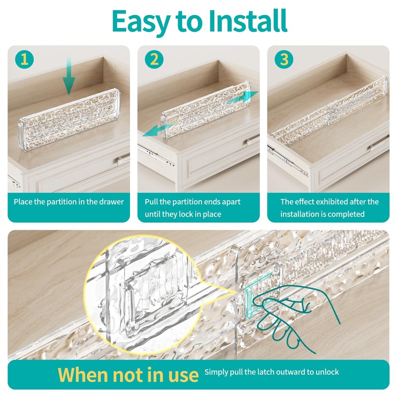 - Easy Installation & Removal: Insert the drawer partition into the drawer, hold both ends of the drawer partition by hand and pull it towards both sides of the drawer. The partition should be tightly attached to both sides of the drawer to complete the installation. When disassembling, you only need to pull the side lock outward and push the partition until the contraction is complete.