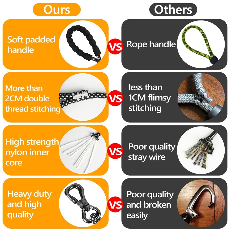 - Soft Padded Handle: The handle of long leash is made of a soft and sturdy EVA,the thickness was upgraded to 0.24 inches, 33.3% thicher than others, which is for amazing comfortable shock grip, protects your hand from rope burn, and will afford you and your dog many enjoyable walks together hassle-free.