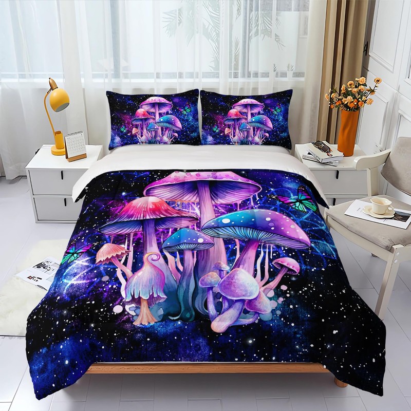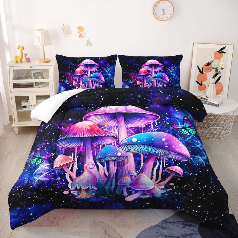 Nttopship Fantasy Mushrooms Comforter Set Full,Galaxy Fantasy 3 Pieces Bedding Set for Teens Kids,Violet Down Alternative Bed Comforters Bedding Sets for All Season
