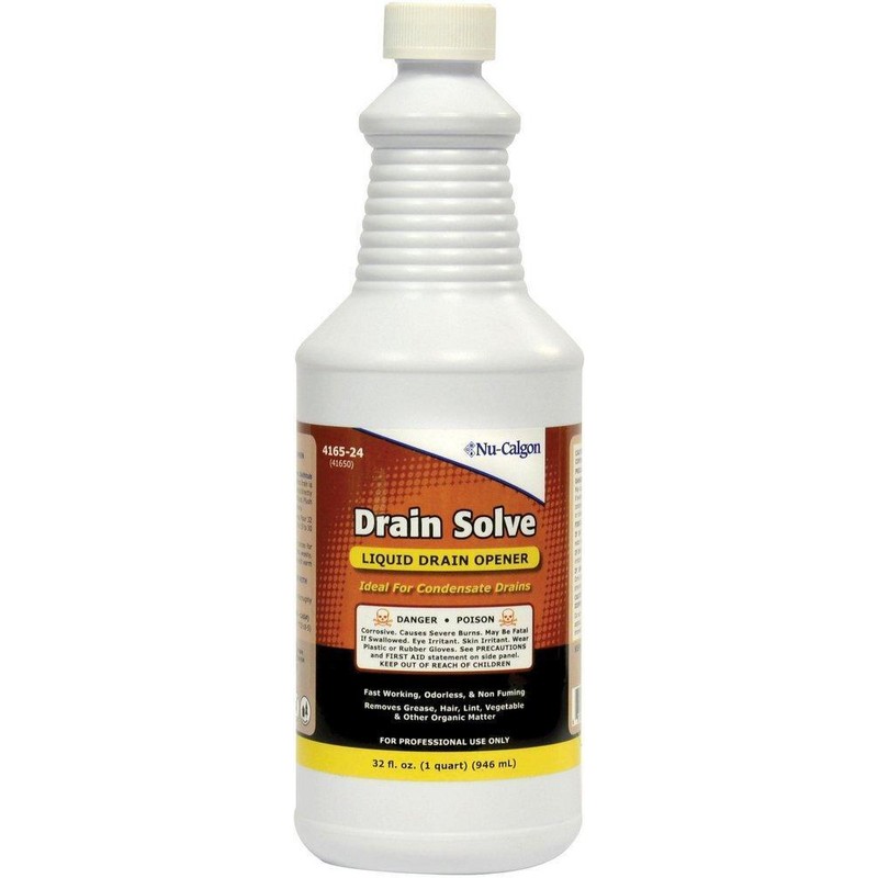 Nu-Calgon Drain Solve 4165-24 is a liquid drain cleaner that effectively removes grease, hair, and organic materials. It is packaged in a one quart bottle and is designed for various plumbing applications.