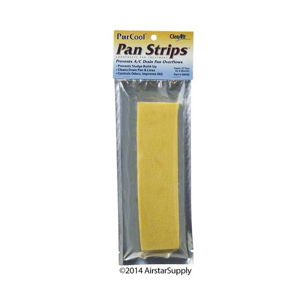PurCool Strips keep A/C and refrigeration condensate pans clean and free flowing. Use PurCool Strips to prevent condensate clogs, costly overflows, and corrosion. PurCool Strips are weighted and will not float or move once placed in the condensate pan. Just place them anywhere in the pan where the PurCool Strip will contact the condensate water and enjoy up to six months of economical protection.