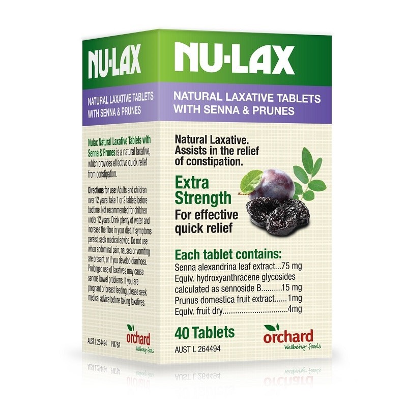 NU-LAX Natural Laxative Tablets with Senna & Prunes has been carefully formulated with a natural combination of Senna and Prunes to produce a highly effective and natural laxative. Senna has been traditionally used for many years to stimulate bowel function and assist in the relief of constipation.