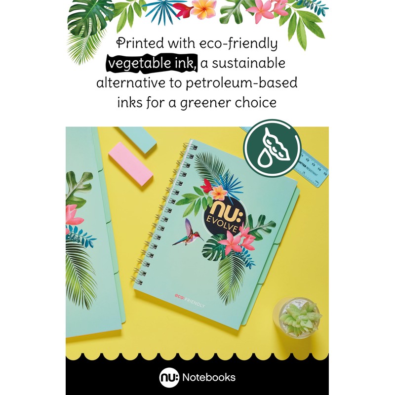 - NU EVOLVE TROPICAL RANGE: Our nu: Evolve range is the UK’s first recycled and recyclable eco-friendly notebooks made using fully recycled FSC-certified paper & board from cover to cover and are printed using vegetable-based inks