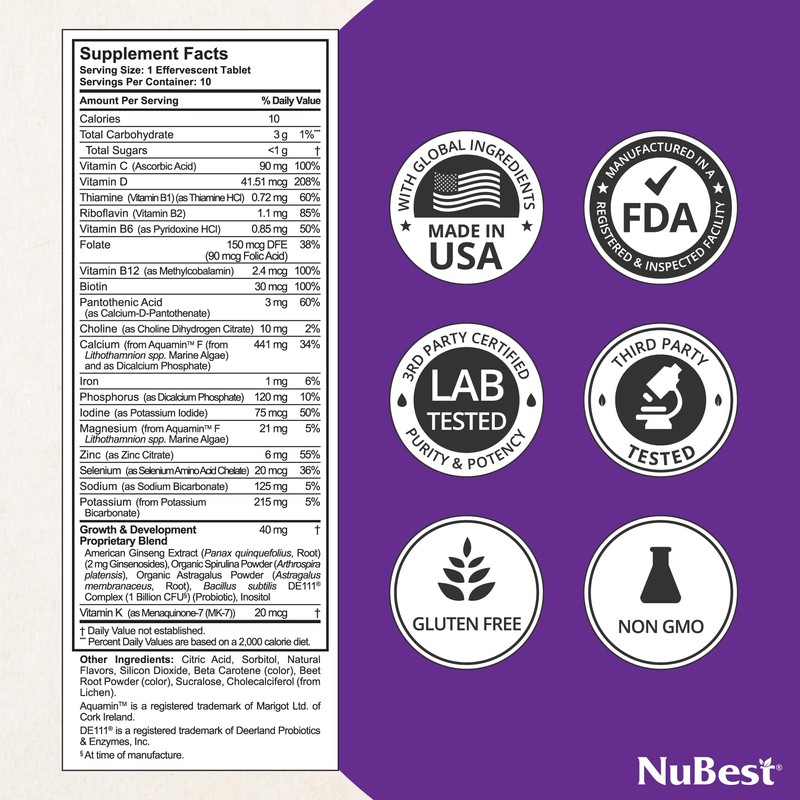 - NuBest Quality: Our orange effervescent tablets are made from natural ingredients with less than 1g of sugar and contain no GMOs, gluten, soy, grain, or wheat. Developed by U.S. Nutritionists, proudly manufactured in the USA in an FDA-registered facility, and certified by GMP, our product is a delicious and trustworthy choice for children and parents alike.