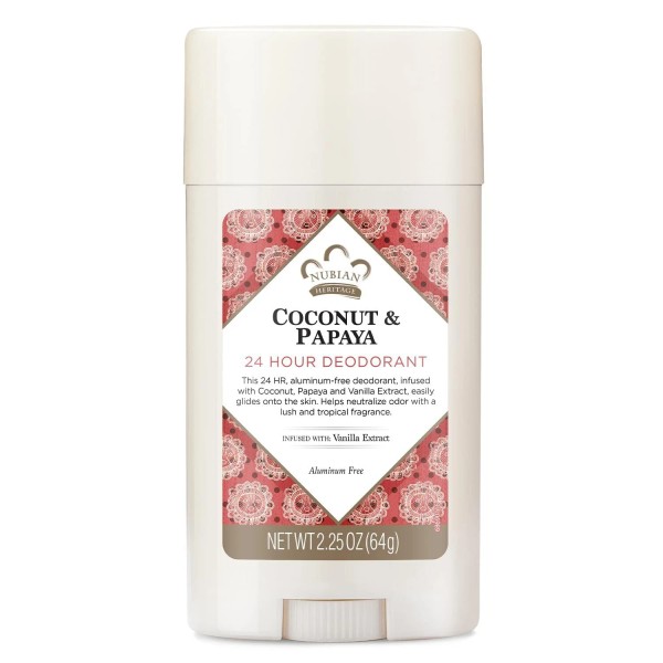 - - [Scent & Protection]: The Nubian Heritage Deodorant, made with the tropical scents of coconut and papaya, claims to refresh and rejuvenate underarms for 24 hours.