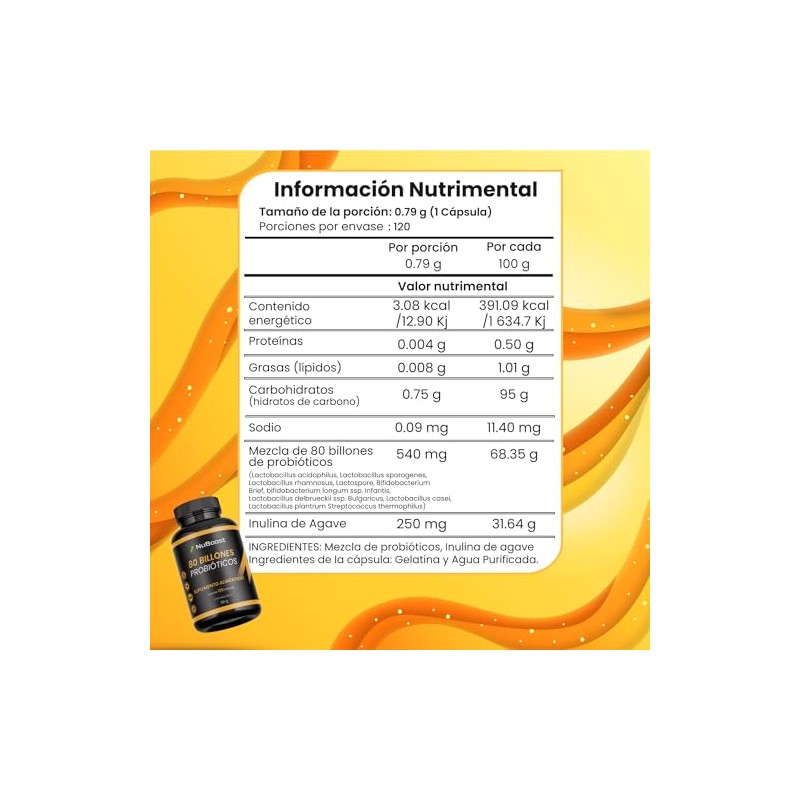 Acerca de este artículo PROBIOTICOS - Promueve una digestión saludable y equilibra la flor intestinal para mejorar la salud digestiva. INULINA DE AGAVE - Mejora y fortalece tu bienestar digestivo con lactobacilos y probióticos, promoviendo un bienestar general. LACTOBACILOS - Favorece la absorción de nutrientes esenciales y mejora la salud en general CONTRIBUYE A REDUCIR LA HINCHAZÓN ABDOMINAL y mejora la regularidad intestinal. Contribuye a reducir la hinchazón abdominal y mejora la regulación intestinal. TOMAR 1 CÁPSULA UNA VEZ AL DÍA, preferentemente con la comida, para disfrutar de sus beneficios.