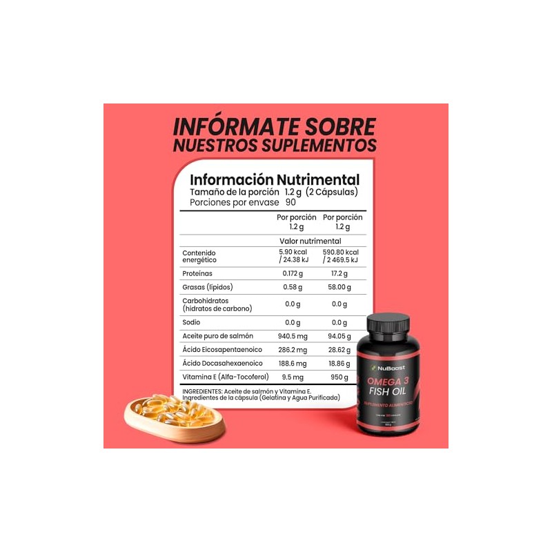 - Acerca de este artículo OMEGA 3 DE ACEITE DE SALMÓN: Disfruta de los beneficios de nuestro aceite puro de salmón, rico en Omega 3, EPA y DHA, apoya la salud cardiovascular y cerebral. Ideal para tu bienestar general. ACEITE DE PESCADO OMEGA 3 DE ALTA POTENCIA: Enriquecido con Omega 3, nuestras cápsulas de aceite de pescado son fáciles de tragar y no dejar sabor a pescado. SUPLEMENTOS ALIMENTICIOS OMEGA 3 1000 MG: Mejora tu salud diaria con nuestras cápsulas de alta dosis de Omega 3. Cada cápsula proporciona 1000 mg de omega 3 puro para máxima eficacia. OMEGA