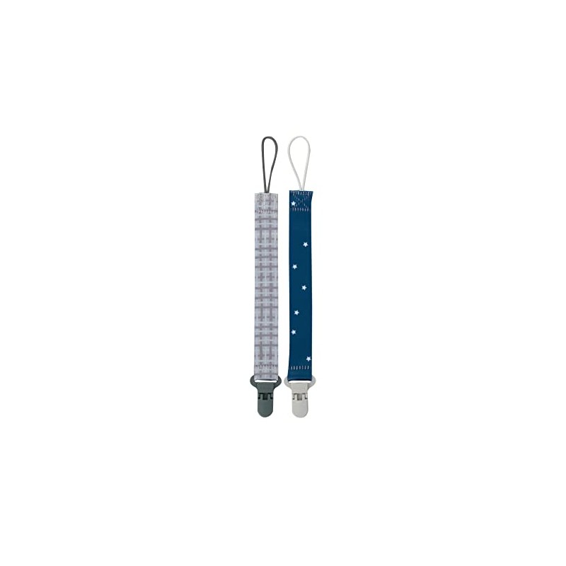 Nuby Pacifinder Pacifier Clip, 2 Pack Pacifier Holder for Boy, Gray Plaid and Blue Stars