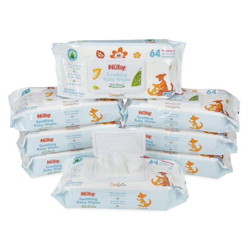 - Be prepared for life’s little boo-boos at or away from home. Nuby’s Soothing Baby Wipes come in 8 packs containing 64-count wipes convenient for travel. With a total of 512 baby wipes, messes won't stand a chance.