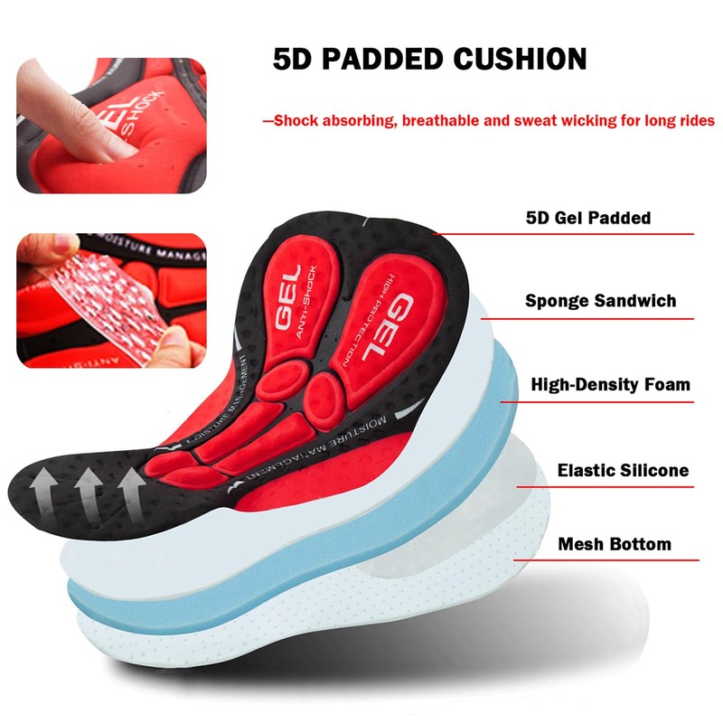 - Ergonomic 5D Padding:The Cycling shorts use a 5D thick saddle with high density foam padding gel for added cushioning and support.The wider seat cushion is ergonomically designed to fit the hips to provide maximum comfort.
