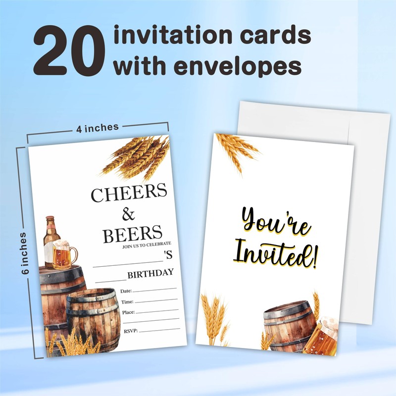 Nuckxy Cheers & Beers Birthday Invitation(4"X 6"), Retro Beer Barrel Double-Sided Invites, 20 Birthday Invitations With Envelopes, Party Decoration & Supplies - A12