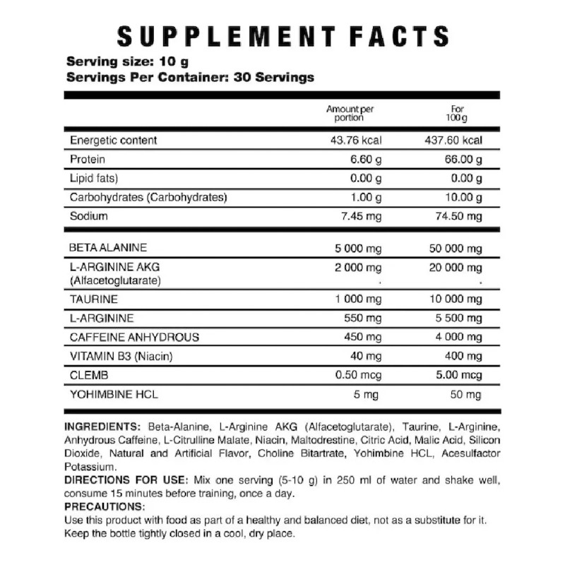 • Ingredientes: Acesulfactor, Anhydrous caffeine, Beta-alanine, Choline bitartrate, citric acid, L-arinine akg (alfacetoglutarate), L-citrulline malate, malic acid, Maltodrestine, Natural and artificial flavor, Niacin, Taurine, Yohimbine hcl, L-arginine, silicon dioxide