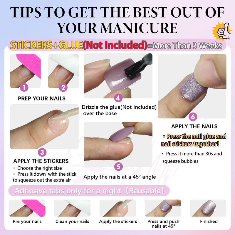 2.Please note that the nail glue is not included.If you want it last for a longer time,please use nail glue instead of the nail stickers.