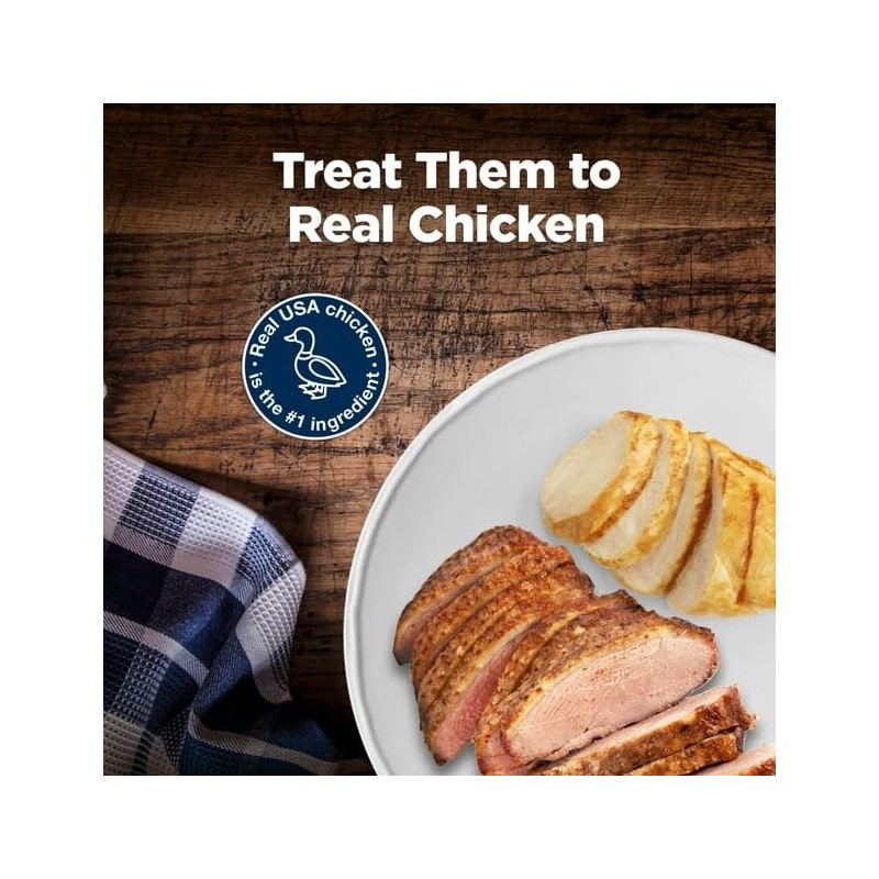 Made with real chicken as the first ingredient, these tender dog treats are easy to tear into smaller pieces, so they're great for dogs of all breed sizes and ages.
