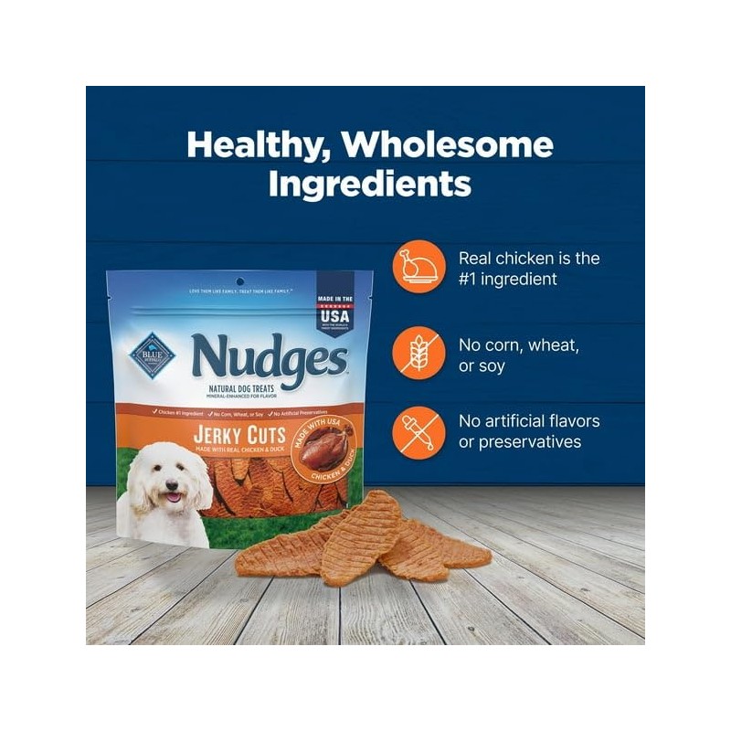 Watch their tail wag when you reward them with Nudges Premium Jerky Cuts Chicken & Duck Dog Treats.