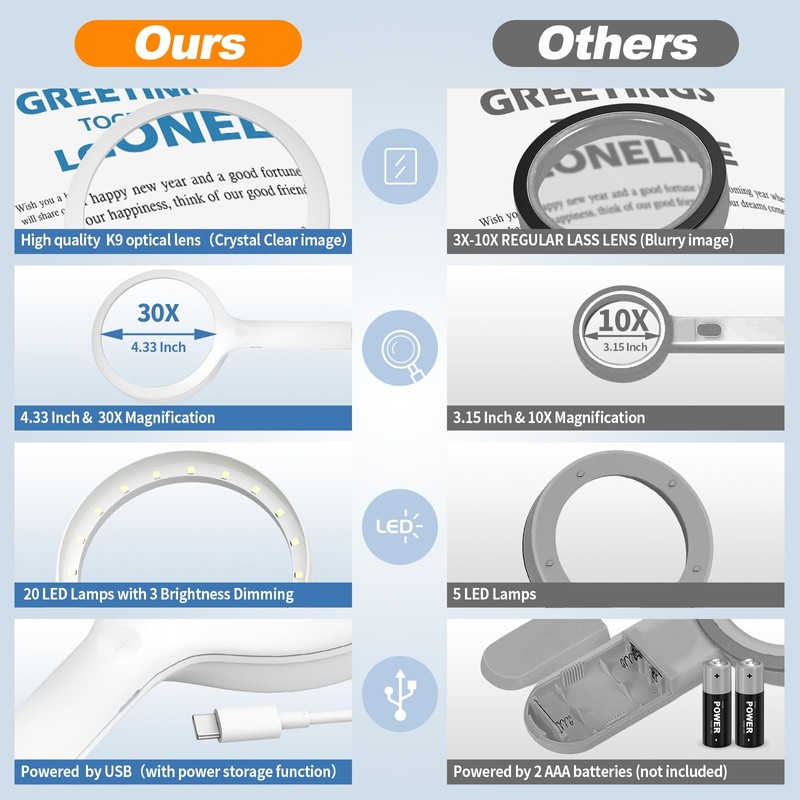 - 30X Magnifier: Magnifying glass for reading provides 30X magnification, which allows those users with macular degeneration/ hyperopia/ myopia to read text and small print better