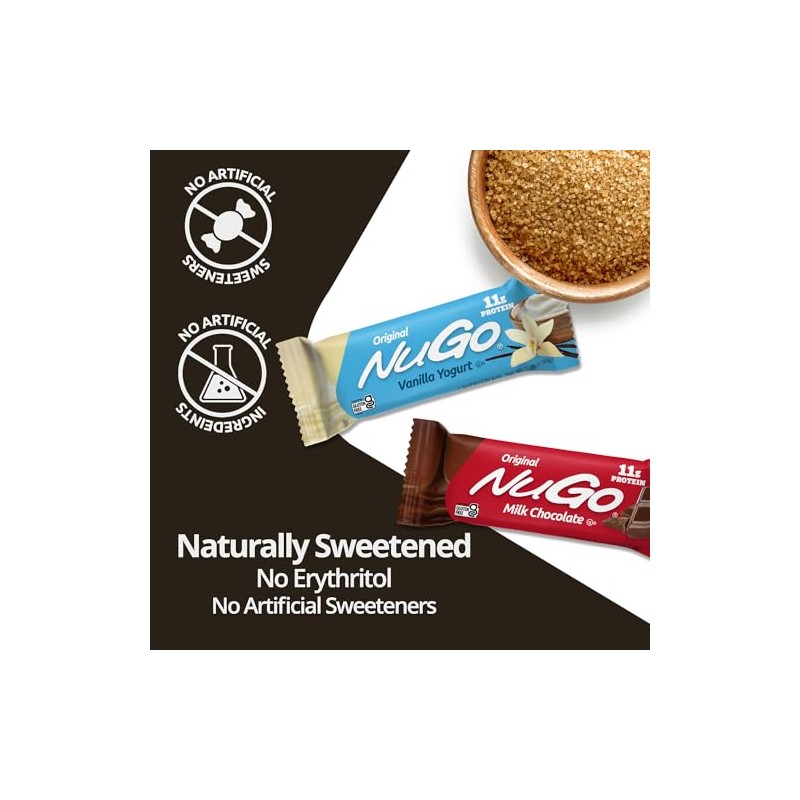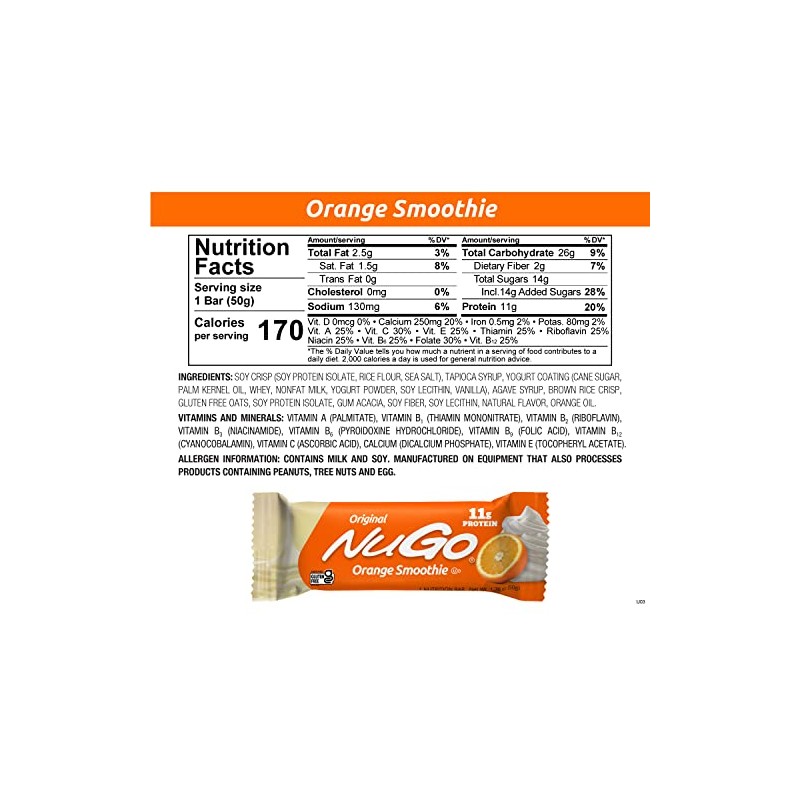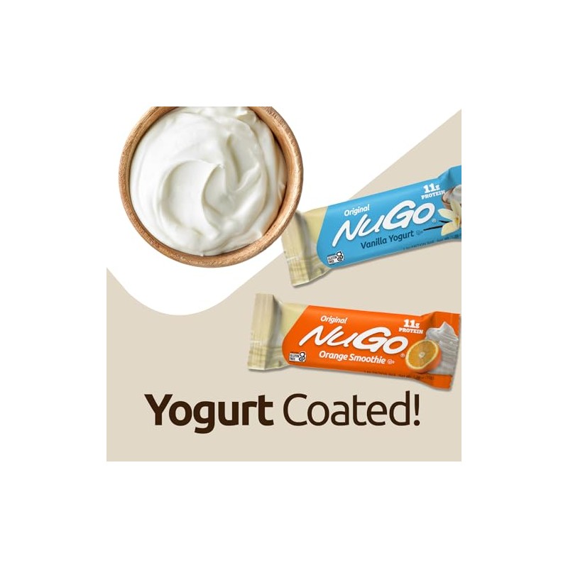 - REAL MILK CHOCOLATE OR YOGURT DRIZZLED: Who doesn't love real, delicious milk chocolate? NuGo Bars are coated in real milk chocolate or a smooth, creamy vanilla yogurt coating with the great taste similar to a Rice Krispies Treat or orange smoothie.