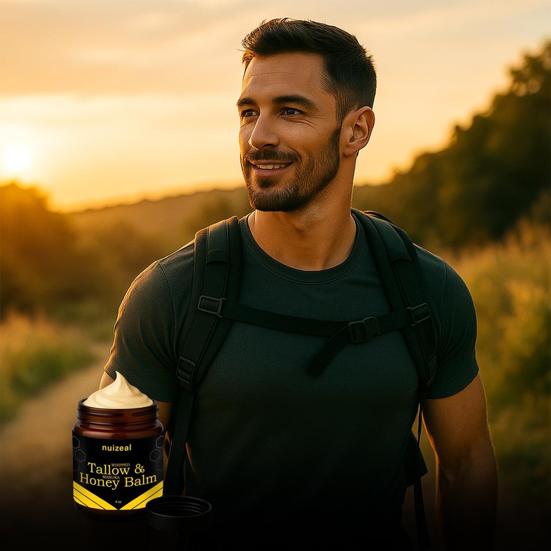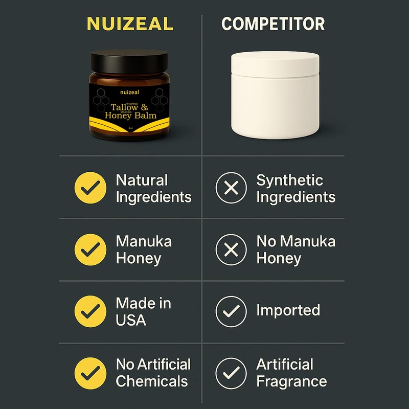 Nuizeal Whipped Tallow & Manuka Honey Balm is a rich, restorative moisturizer handcrafted with grass-fed beef tallow, organic jojoba oil, manuka honey, and herbal infusions of lavender and calendula flowers. Designed to nourish and heal dry, irritated, or inflamed skin, this 4 oz balm targets concerns like eczema, psoriasis, and acne without harsh chemicals or synthetic fragrances. Our tallow is rich in naturally occurring fat-soluble vitamins A, D, E, and K, offering deep moisture and skin regeneration. Manuka honey and calendula support skin healing, while jojoba oil balances and softens. Unlike typical tallow balms, our whipped blend has a light, herbaceous scent thanks to its botanical infusionno beef smell here. Made in small batches for maximum freshness and potency.