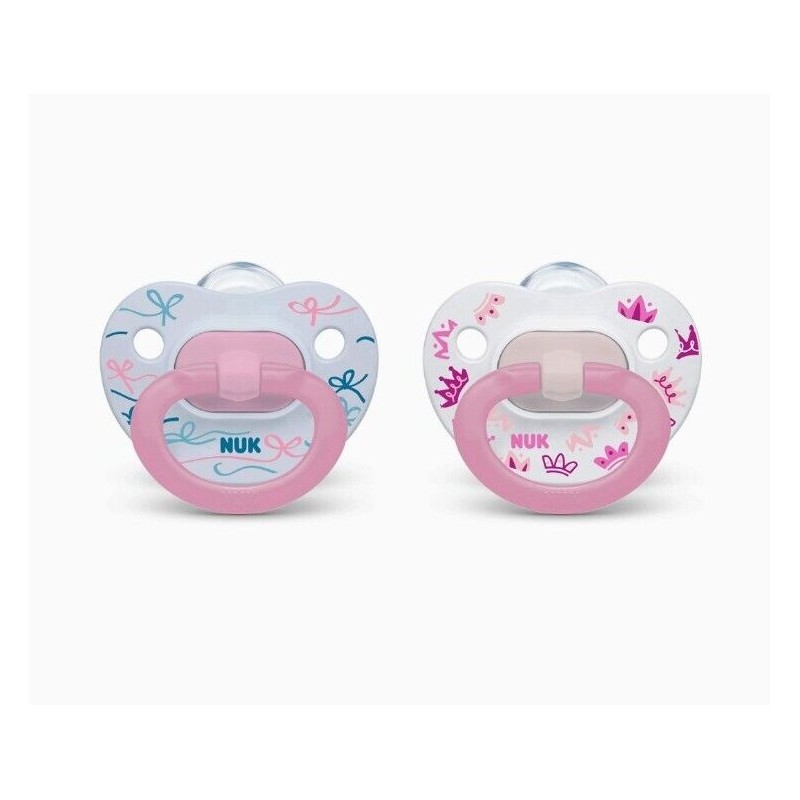 NUK 2 Pack Orthodontic Pacifier Girl Pink Crowns And Bows 18-36M NEW