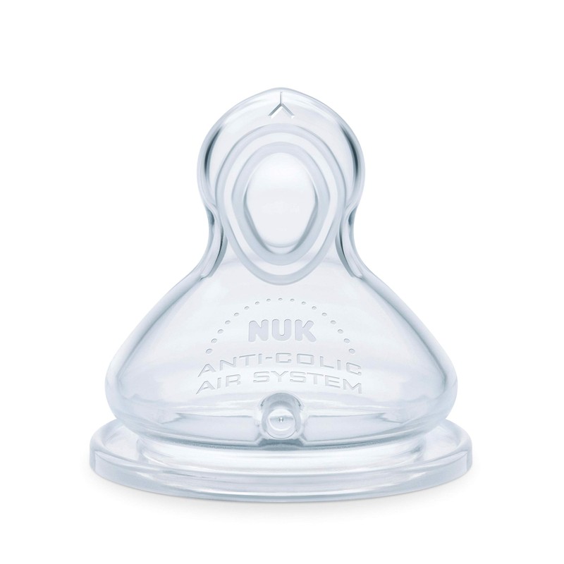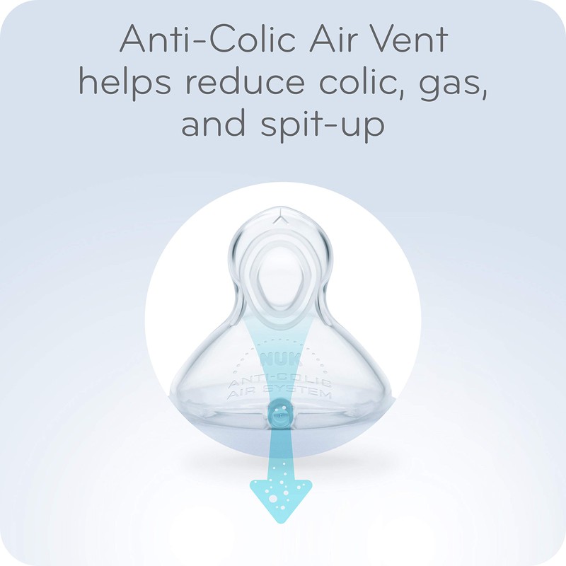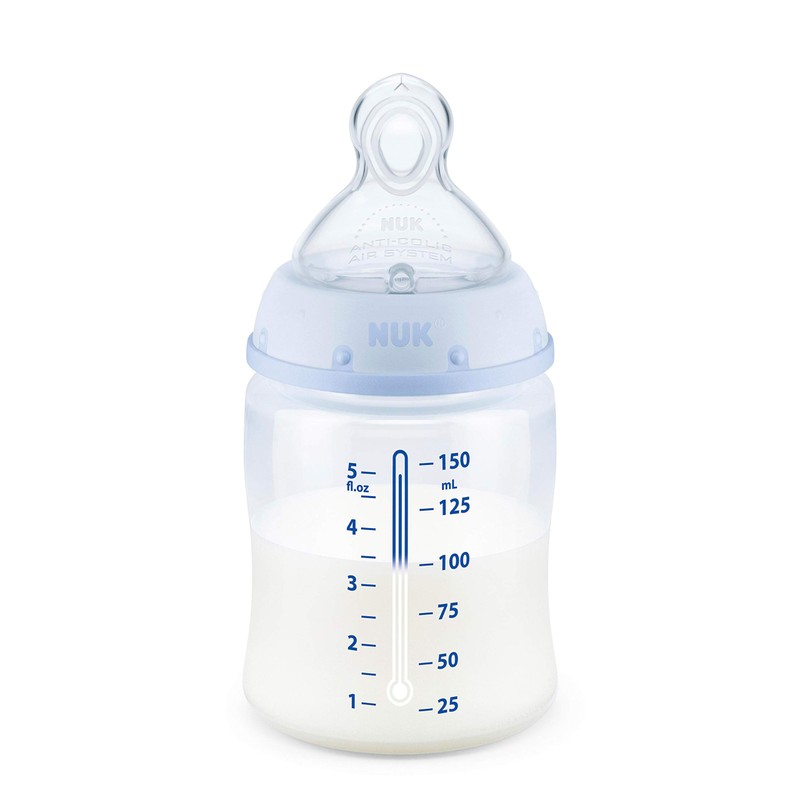 NUK Smooth Flow Bottles are the anti-colic solution for bottle feeding, featuring a unique nipple design that allows baby to control the flow rate for colic-free feeding. This Smooth Flow nipple adjusts the flow based on how your baby drinks, adapting to their suction strength to ensure they will always have the right flow rate. The SafeTemp temperature indicator lets you know when milk is too hot with just a glance. The blue thermometer indicator fades when milk is too hot and reappears when milk has cooled and is safe to drink.