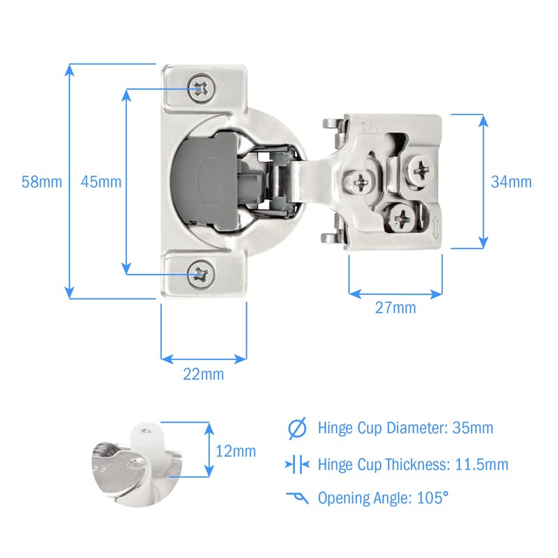 - 105 DEGREE OPENING angle with 35mm cup size diameter for common cupboard cabinet door styles. Screw hole distance is 45mm.
