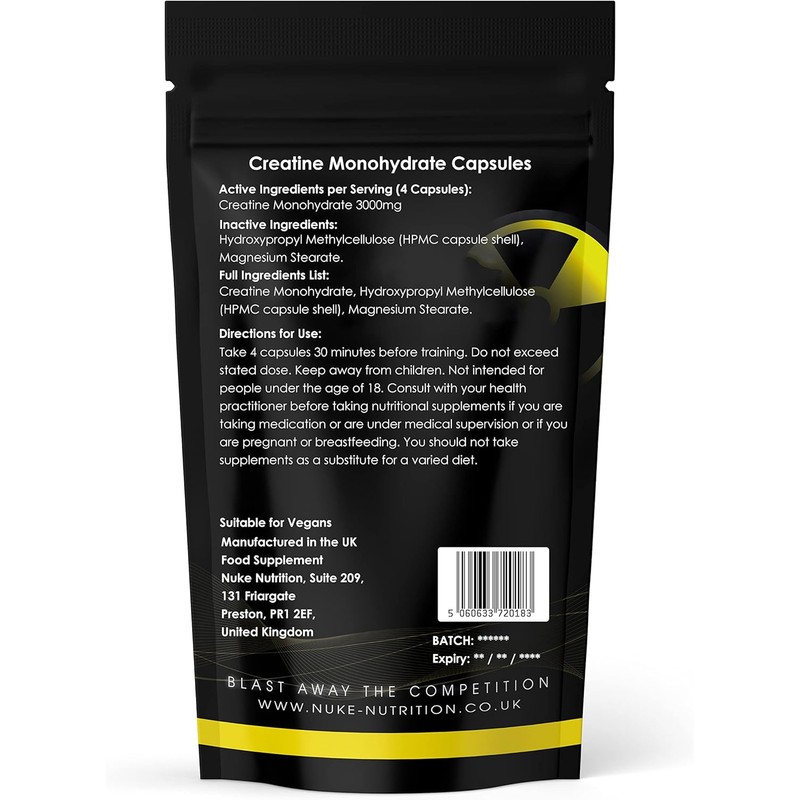 - MICRONISED QUALITY FOR RAPID ABSORPTION - At Nuke Nutrition, we live by the mantra of pure, premium and perfect quality. To give our creatine monohydrate capsules an extra edge over the competition, we micronised the creatine powder within our capsules for ultra-rapid absorption and to minimise wastage. This means that just before a workout, you can take our creatine capsules safe in the knowledge that within seconds, the creatine is flowing within your system for ultimate effectiveness.