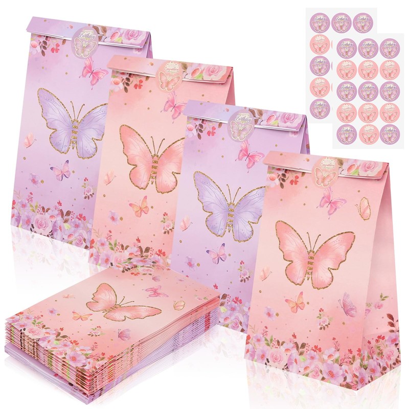 Nukssi 24pcs Pink Gift Bags With Stickers, Cute Butterfly Flowers Paper Gift Bags Small Size 8.7x5.1x3.1 Purple Party Favors Bags Bulk Mini Tiny Pink Goody Bag for Wedding Rainbow Kids Girl Birthday