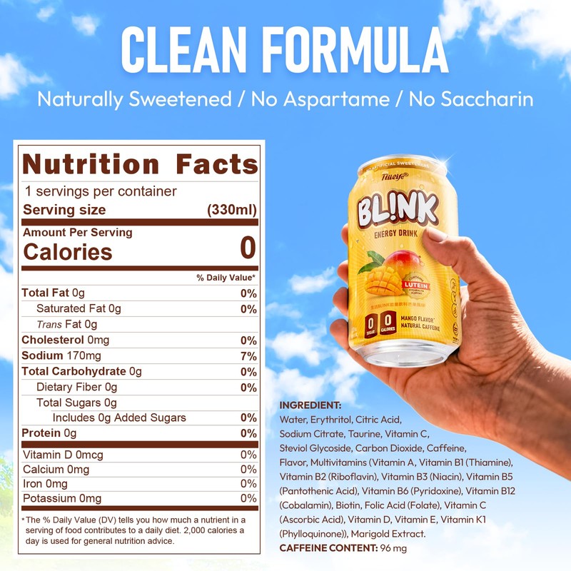 - VEGAN, GLUTEN-FREE, NO COMPROMISES- Every can of BL!NK is gluten-free and refreshingly guilt-free. Available in Mango and Mixed Berry Flavor, it’s energy you can feel good about — from ingredients to impact.