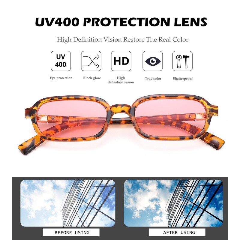 - UV400 PROTECTION LENSES - The UV400 lenses in retro 90s sunglasses minimize glare and boost contrast, enhancing visual clarity and reducing eye fatigue. To safeguard your eyes from harmful UV rays, rectangular sunglasses for women feature lenses with advanced UV protection coatings
