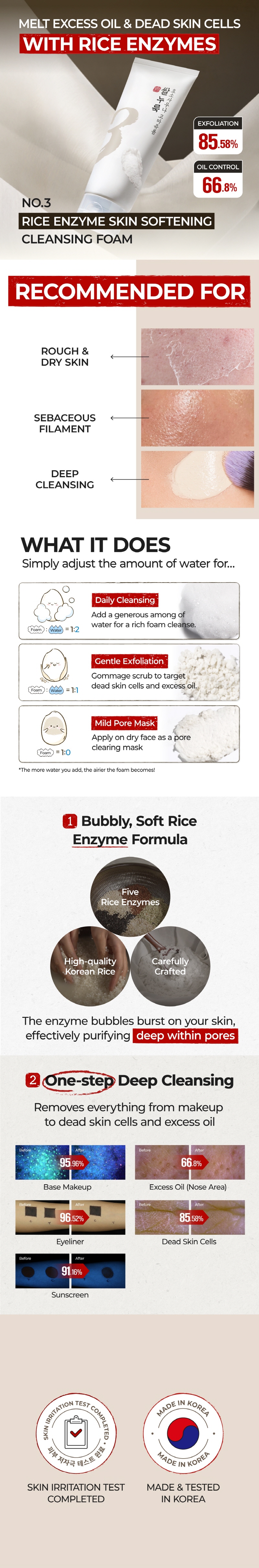 The rice yeast gommage effectively dissolves dead skin cells and sebum. Improves dead skin cells and sebum. The enzyme bubbles pop on skin to cleanse wastes deep inside pores. Provides excellent 5-step cleansing that cannot be found anywhere else. Provides instant cleansing of base and point makeup, along with sunscreen, dead skin cells, and sebum. 100% satisfaction in clearing uneven dead skin cells, sebum, and pore cleansing. Made with gentle cellulose separated from plants instead of irritating chemical scrub agent to provide mild exfoliation. Completed low skin irritation test. Improves skin moisture barrier and inner skin tightening after cleansing. Completed skin texture and tone improvement tests.
