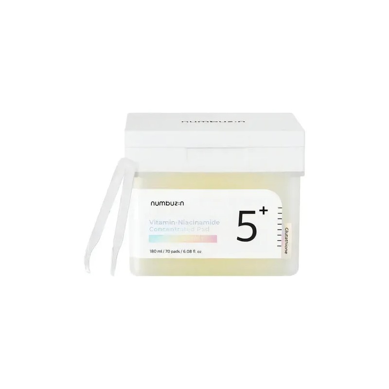 Numbuzin - No 5 Vitamin-niacinamide Concentrated Pad 180 Ml' es un producto de cuidado facial que viene en un contenido de 70 pads de algodón con un volumen total de 180 ml. Este tónico en almohadillas de algodón ilumina la piel, iguala el tono y reduce la apariencia de manchas oscuras. Su fórmula incluye glutatión, un componente que unifica el tono de la piel y previene el envejecimiento gracias a su efecto antioxidante. Los discos son 100% puro algodón, diseñados para no irritar la piel. Para su uso, simplemente tome un algodón después de la limpieza y páselo suavemente por todo el rostro.