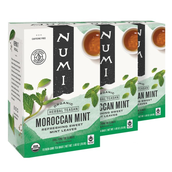 Numi Organic Tea Moroccan Mint, (Pack of 3 Boxes) 18 Bags per Box, Premium Caffeine-Free Herbal Tisane, Premium Organic Non-Caffeinated Tea in Non-GMO Biodegradable Tea Bags